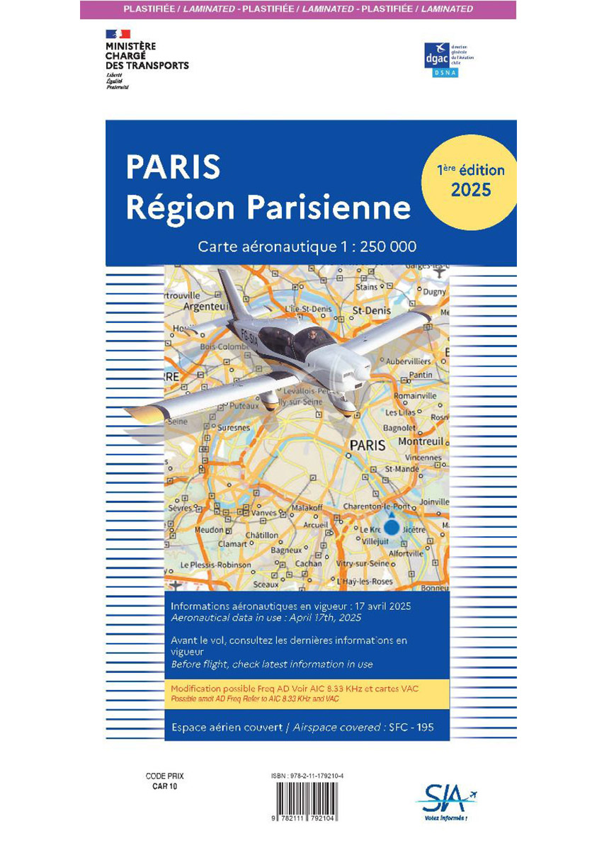 Couvre les espaces aériens compris dans la zone de Paris. La carte étant au 1/250 000, elle est idéale comme complément aux autres cartes VFR pour avoir plus de détails. Version plastifiée.